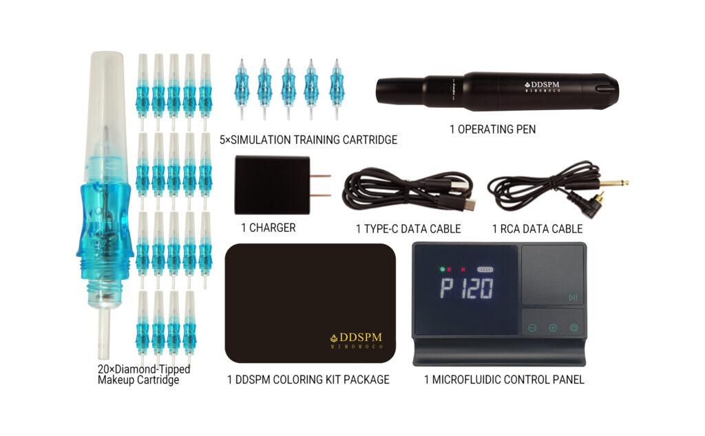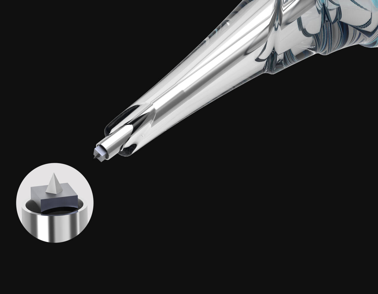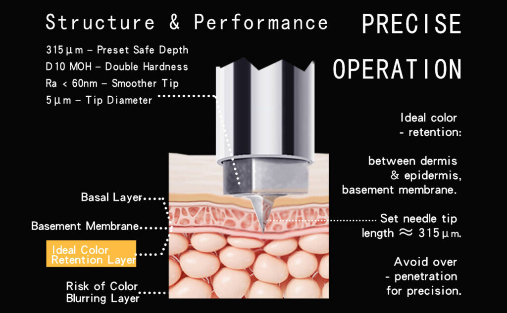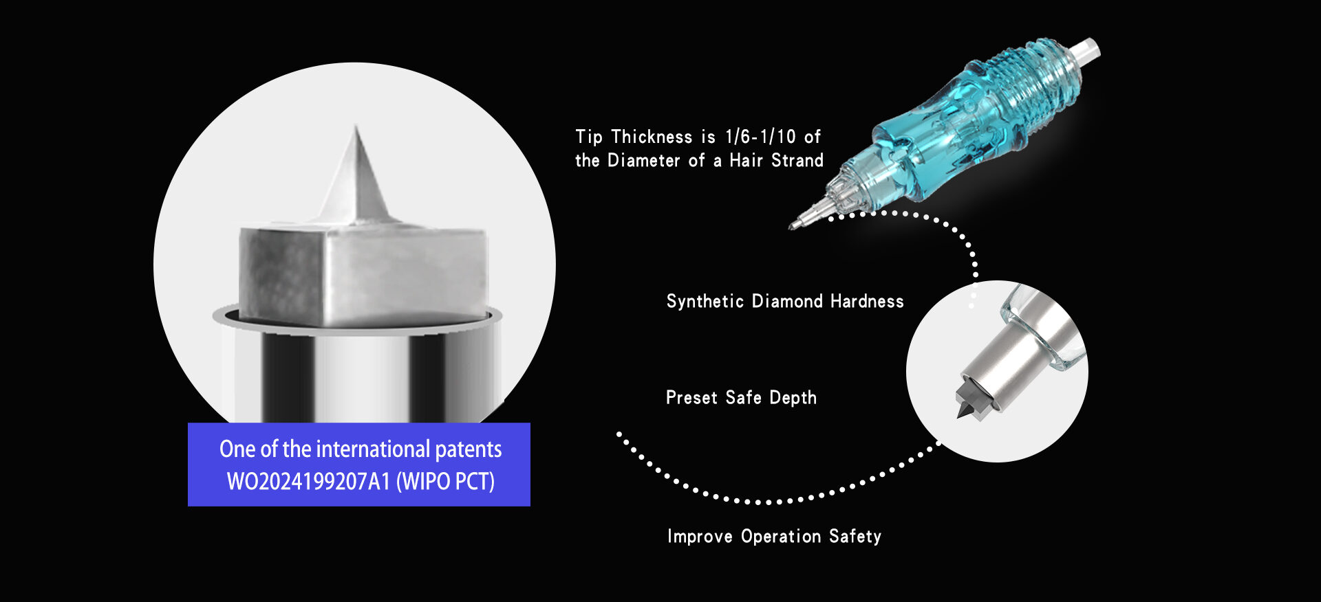 Non-metallic Needle for DDSPM, 1/10th the Skin DamageDDSPM Non-cylindrical Needle Supports One-Stroke ColoringWhen performing horizontal movements like drawing lines, the tip and side edgeswork simultaneously to pierce the skin, preventing any tearing or damage
